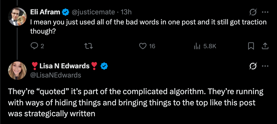 Additionally, Edwards claimed that common crypto phrases like “to the moon,” “100x,” and “altseason” were flagged by X’s AI as spam, causing posts to be buried for weeks. She added that even legitimate threads received only 300 to 800 views if the user’s posting history over the past 90 days contained what she described as “too much crypto DNA.”
