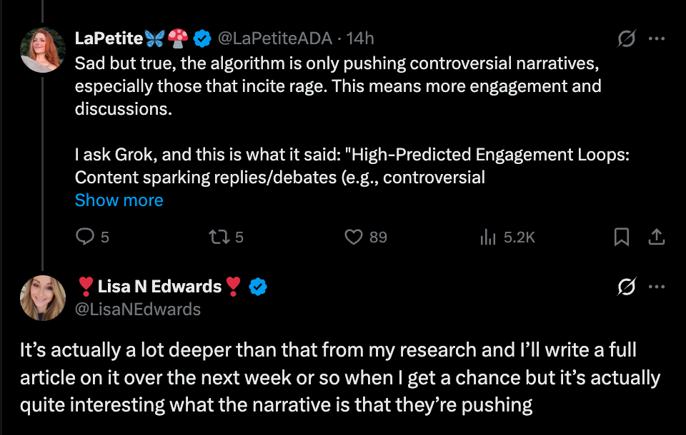 Other crypto content creators expressed support for Edwards, with one noting that the current X algorithm appears to favor “controversial narratives, particularly those designed to provoke strong reactions.”